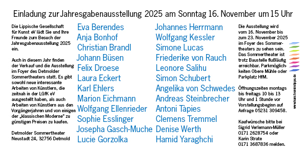 Die Lippische Gesellschaft für Kunst lädt immer zum Ende des Jahres – üblicherweise Mitte bis Ende November – die Mitglieder und Kaufinteressenten ein, sich einen Überblick über die jeweiligen Jahresgaben zu verschaffen und die Chance zum Erwerb eines Bildes zu bezahlbarem Preis zu nutzen.